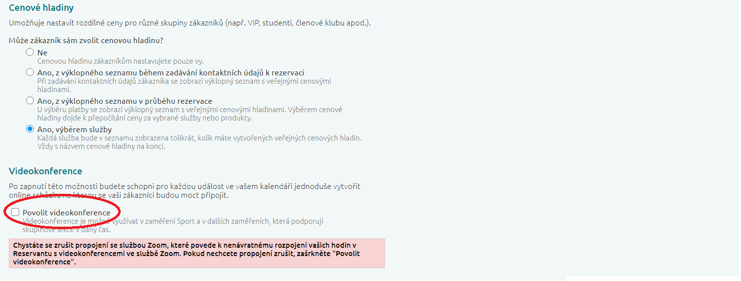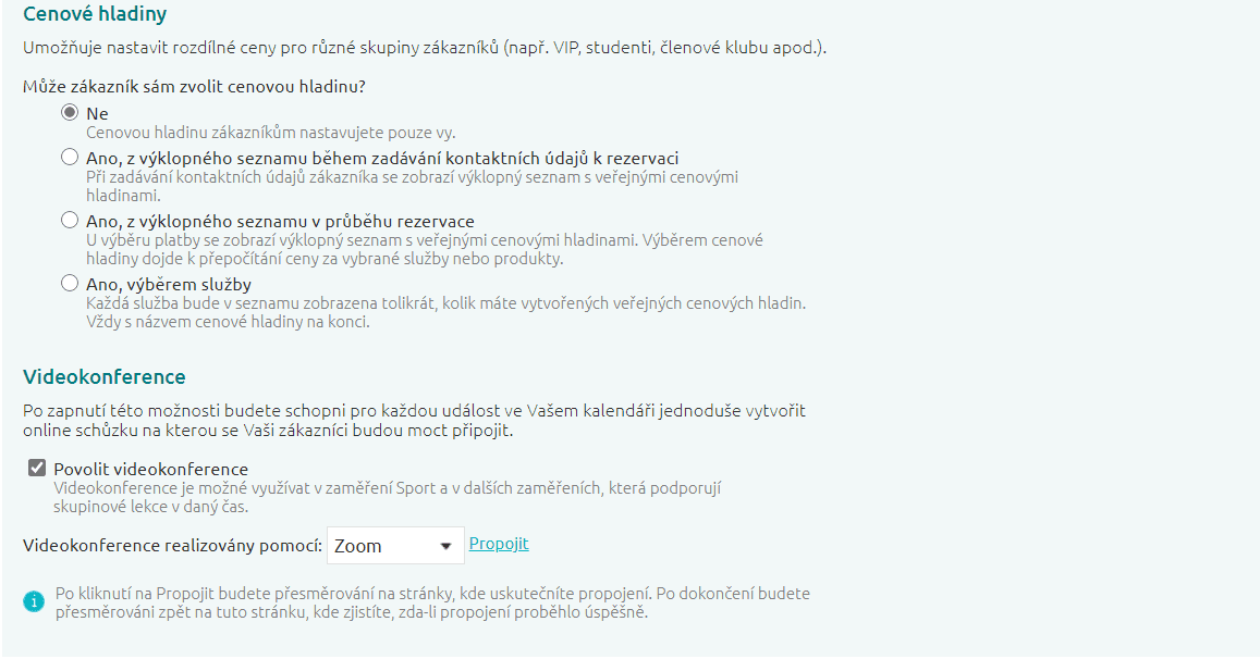 Videokonference je možné využívat pouze v zaměřeních, která podporují skupinové lekce v daný čas. Např. Sportoviště, Obecné – Skupina zákazníků v pevný čas aj.