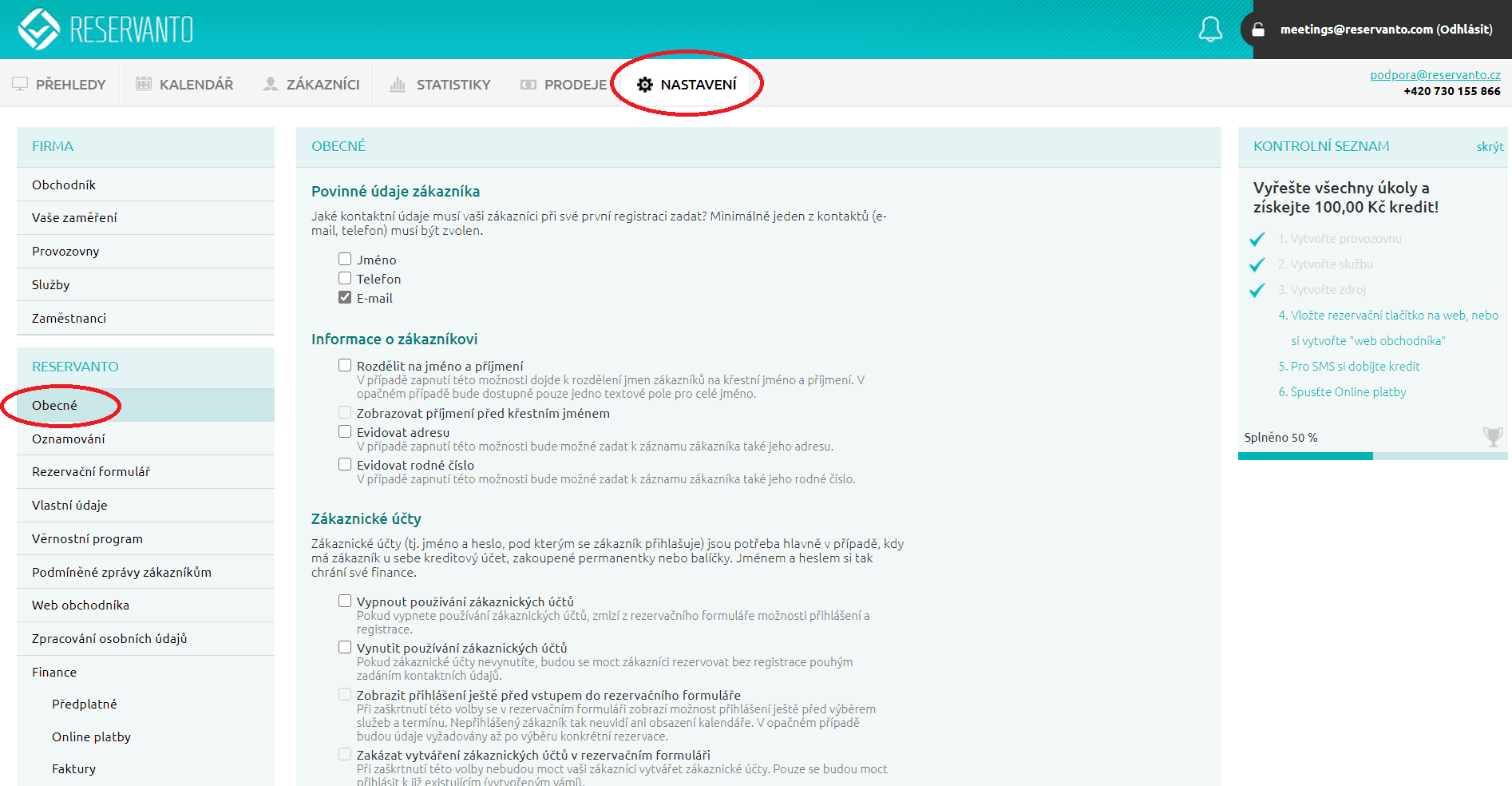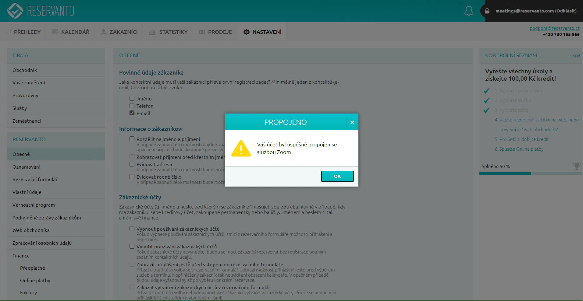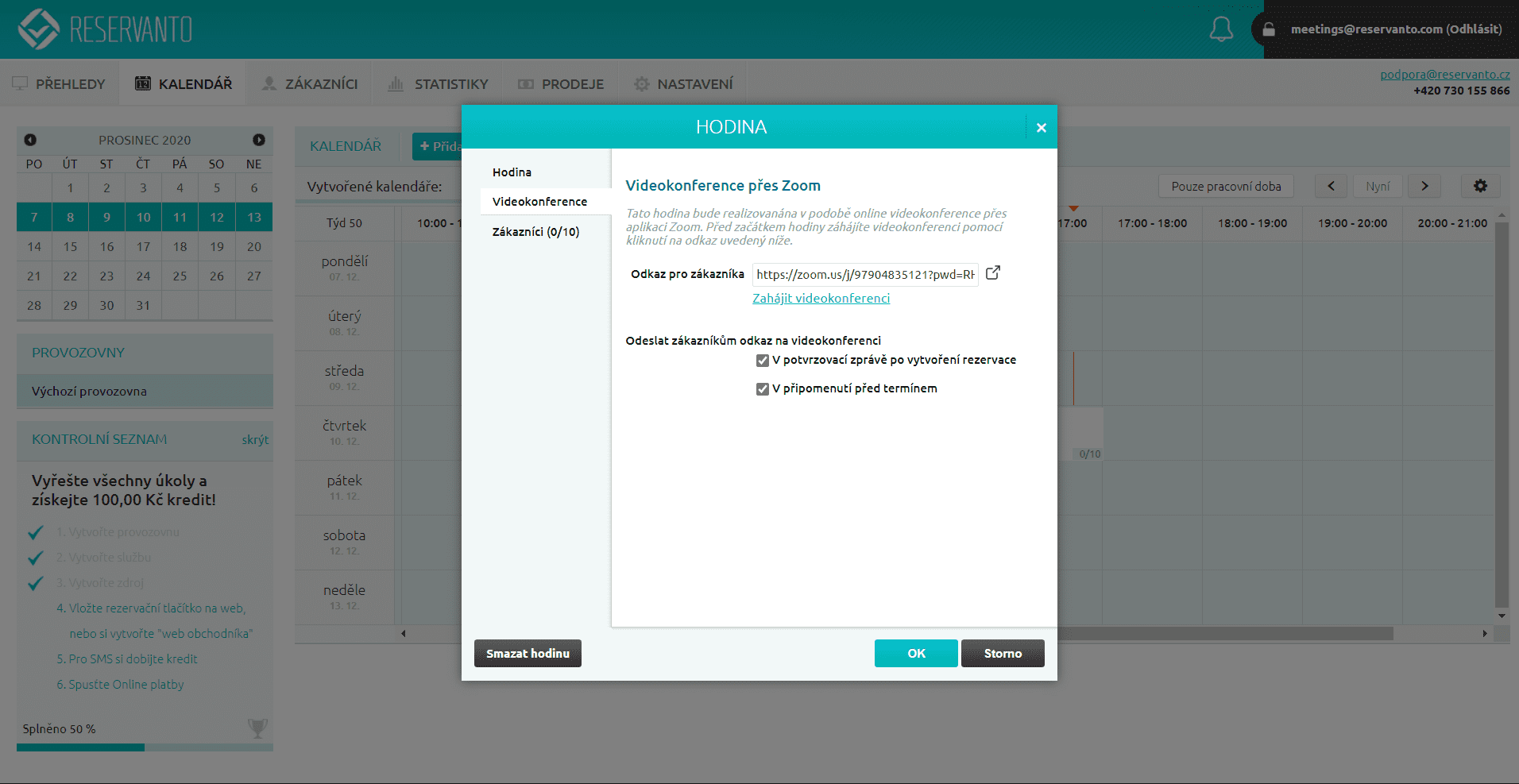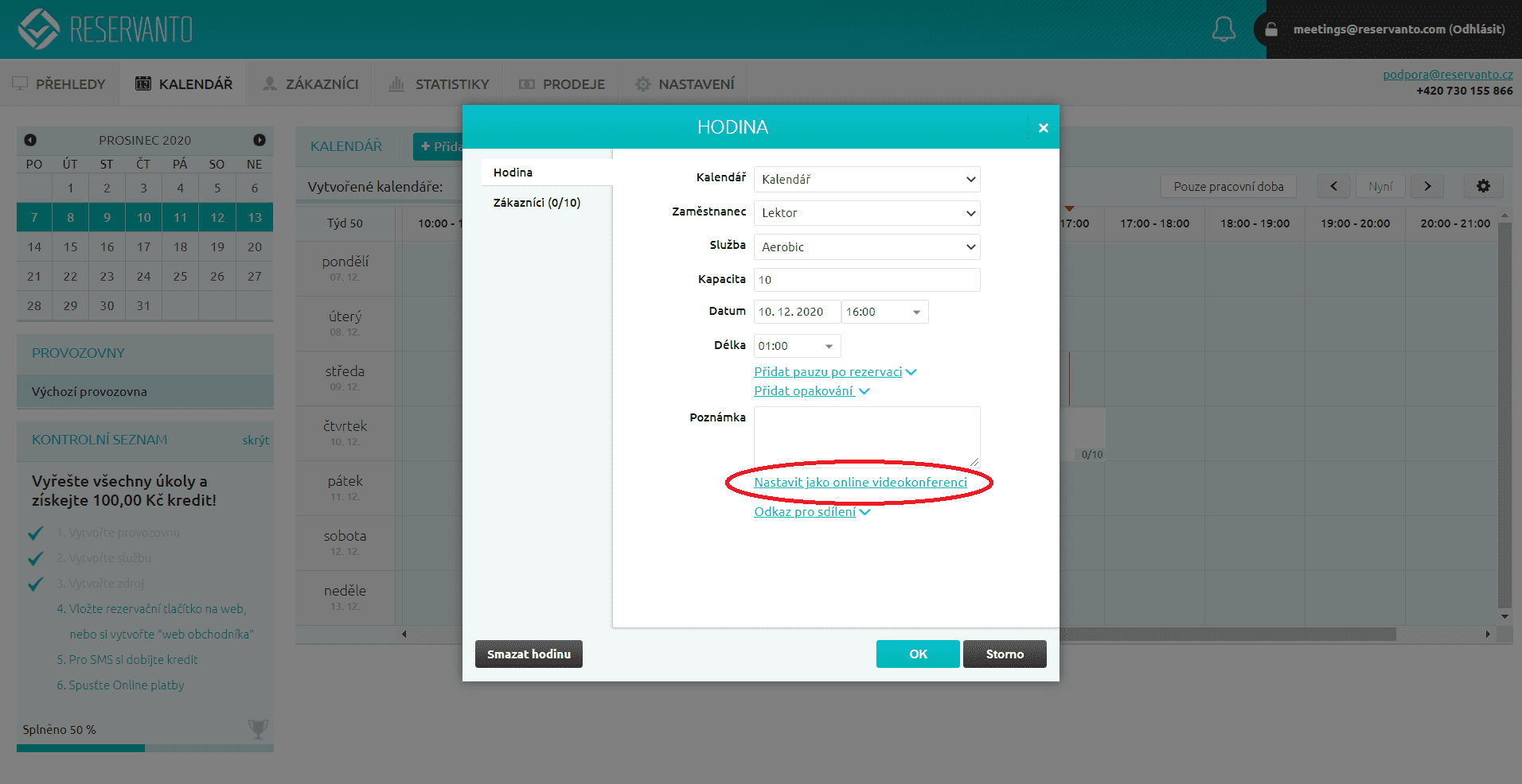 Přihlaste se do administrace vašeho Reservanta, v části Nastavení přejděte do sekce Obecné a poté se posuňte do části Videokonference (odkaz zde).
