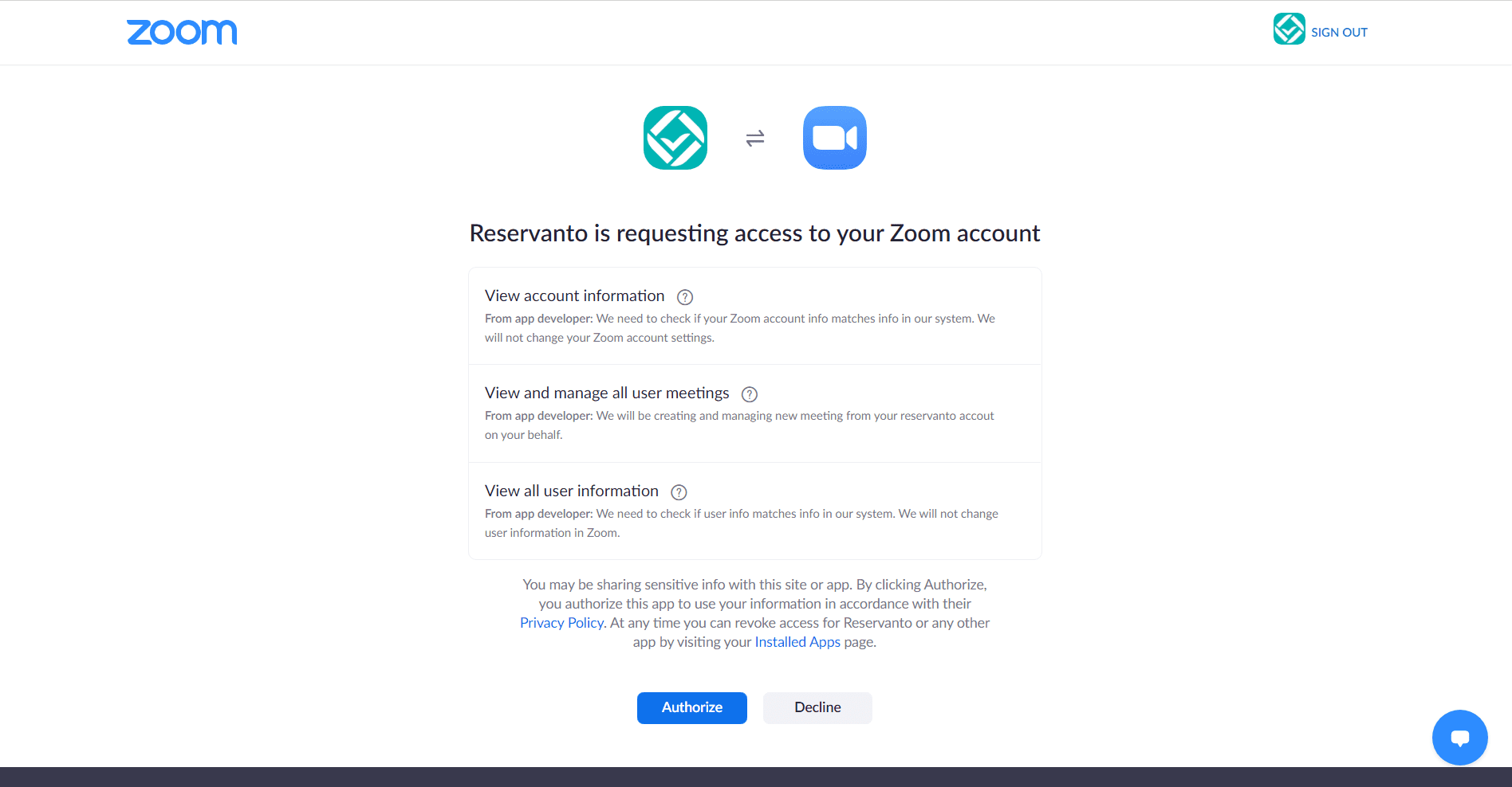 Po kliknutí budete přesměrování na stránku Zoomu, kde po přihlášení potvrdíte oprávnění Reservanta k přístupu do vašeho Zoom účtu.