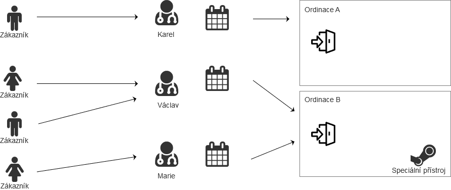 Zákazník si bude stále vybírat mezi terapeuty, ordinace ho nezajímají (a ani je při výběru nevidí). Pokud zvolí službu Vyšetření pomocí TR-THERAPY, automaticky bude obsloužen pouze v Ordinaci B. Pokud zvolí jinou službu, Reservanto vybere ordinaci výše zvoleným způsobem. Pokud budou obě ordinace ve vybraný čas obsazeny, zákazník si už nebude moct tento čas zvolit, i kdyby byl vybraný terapeut k dispozici.