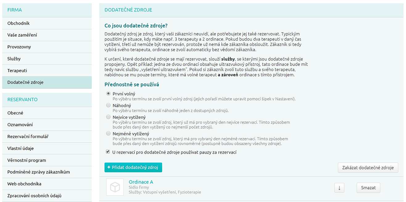 Dodatečný zdroj je zdroj, který vaši zákazníci neuvidí, ale potřebujete jej také rezervovat. Typickým použitím je situace, kdy máte např. 3 terapeuty a 2 ordinace. Pokud budou dva terapeuti v daný čas vytíženi, třetí už nemůže být rezervován, protože už nemá kde zákazníka obsloužit. Zákazník si tedy vybírá svého terapeuta, ordinace se zvolí automaticky bez vědomí zákazníka.