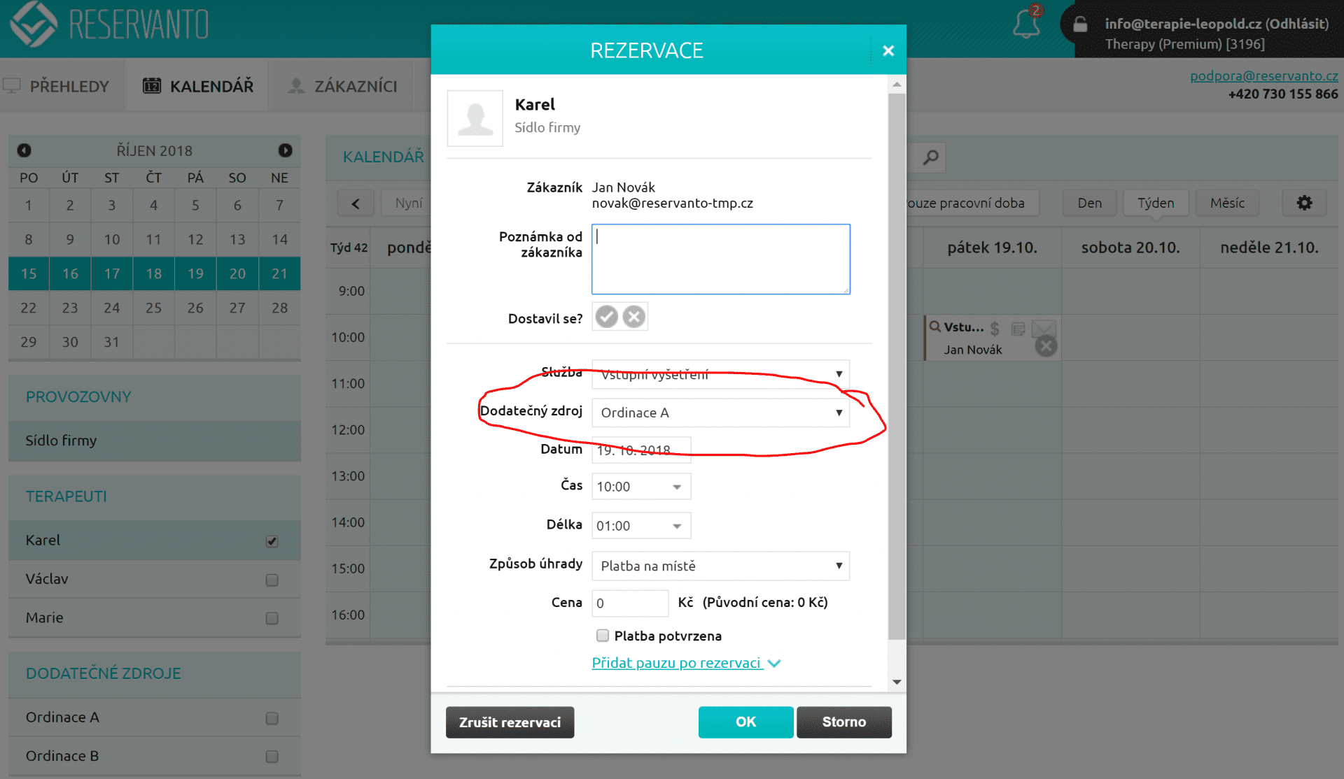 A navíc, pokud budete chtít ručně přesunout rezervaci terapeuta do jiné ordinace, můžete to provést v editaci rezervace, jako je zobrazeno na následujícím obrázku.