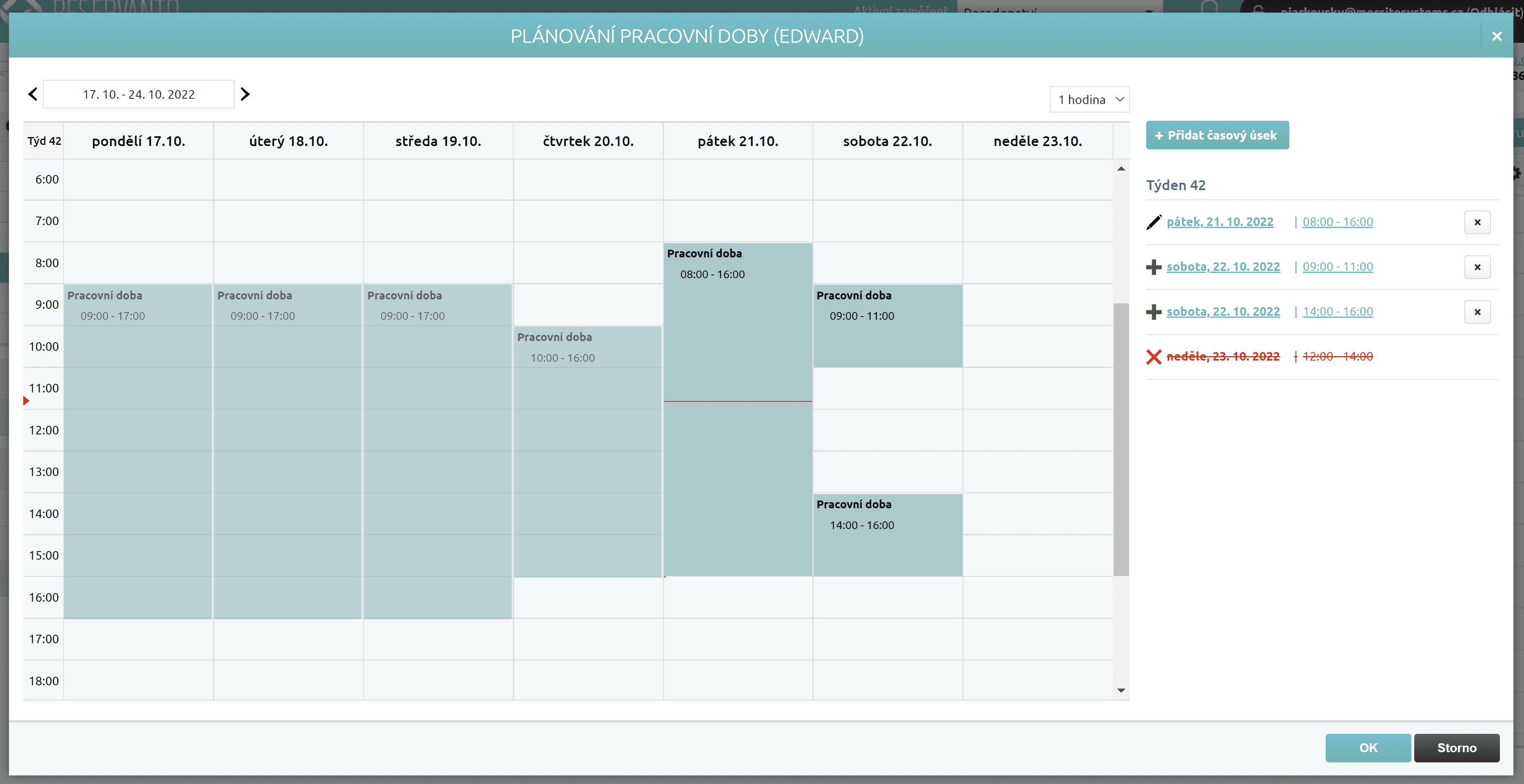 Máte-li u zdroje povolené plánování pracovní doby, klepněte do volného místa v kalendáři a z výklopného menu vyberte volbu Naplánovat pracovní dobu. Zobrazí se okno s pohledem na kalendářní týden (ten lze měnit výběrem jiného týdne vlevo nahoře). Zde můžete vytvářet jednotlivé časové úseky, upravovat je a mazat. Je zde i zobrazena případná pracovní doba zdroje či provozovny (v závislosti na nastavení popsaném výše). Tu je možné také upravovat.