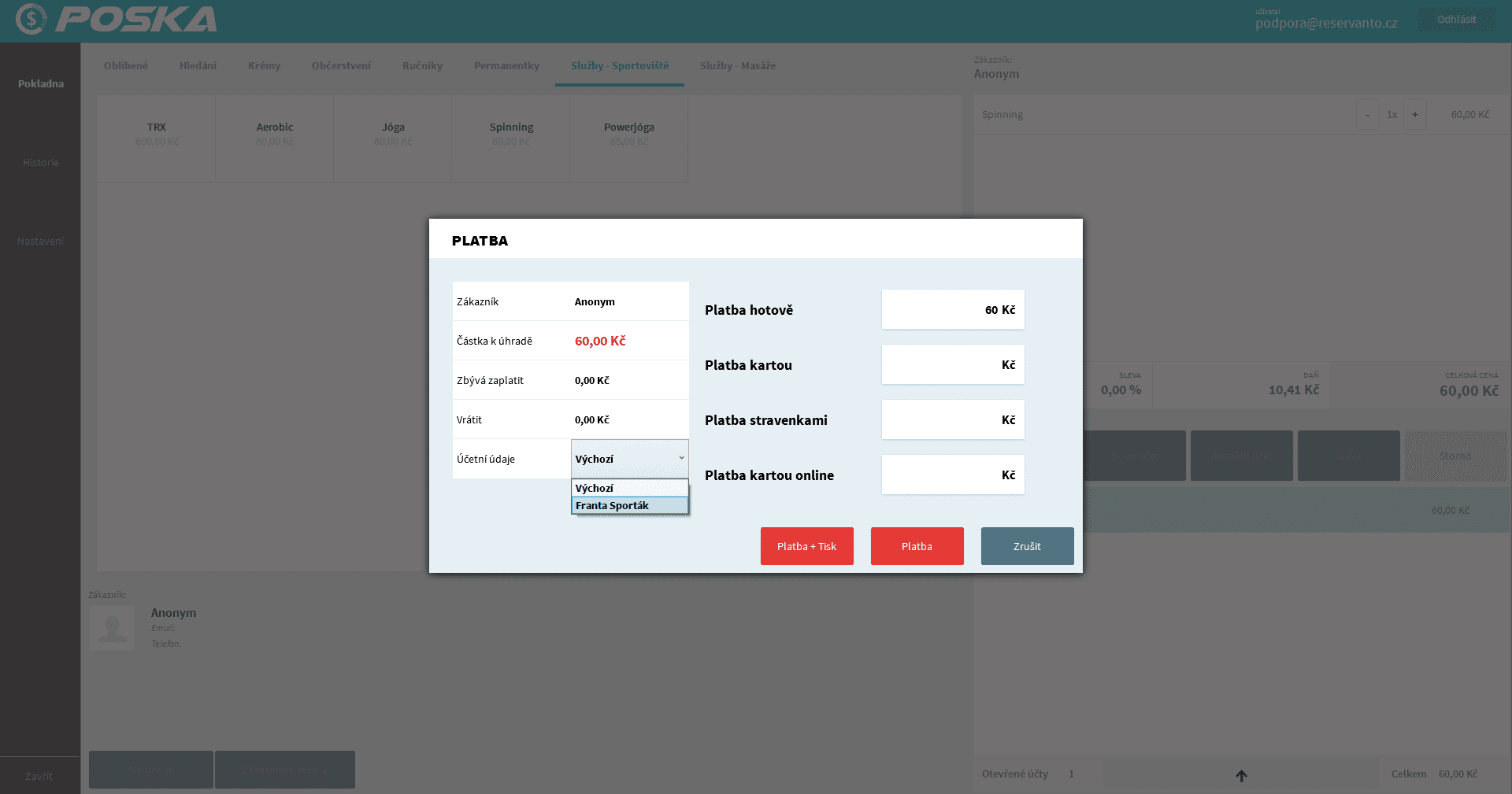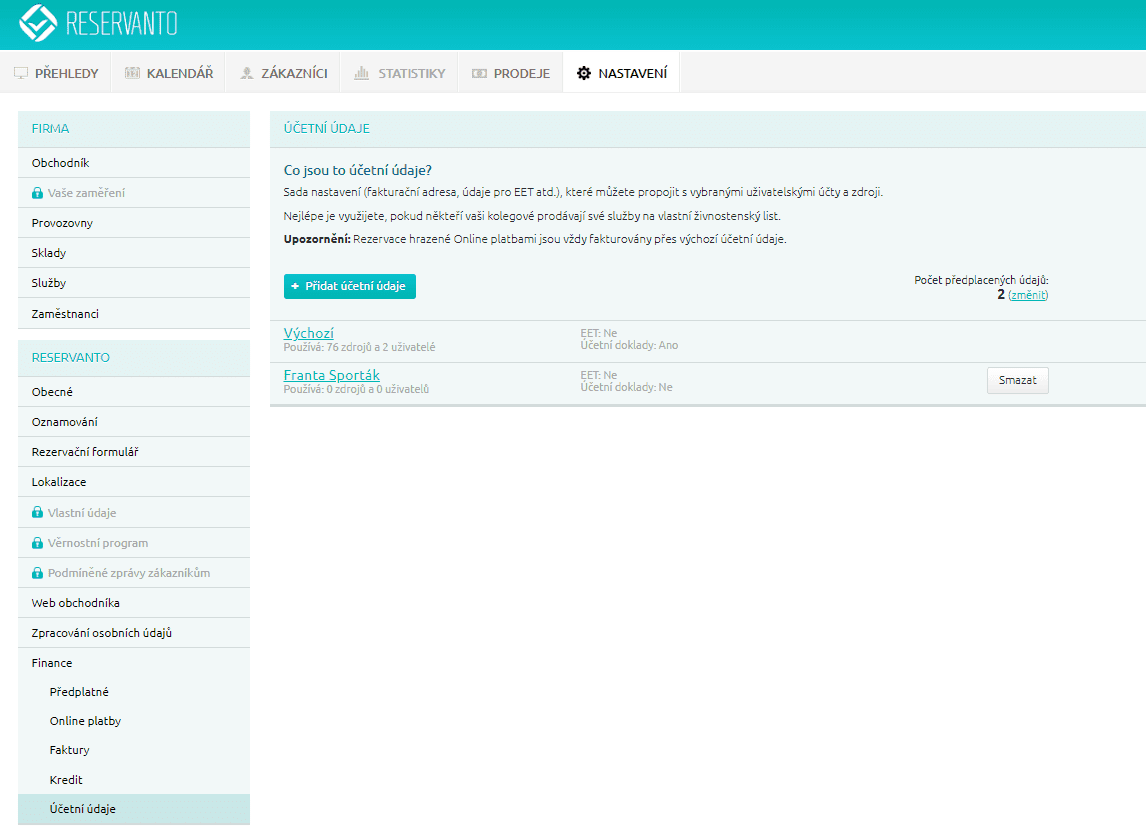 Funkce je k dispozici pouze pro uživatele pokladního systému Poska. Pokud si v Reservantu zadáte více účetních údajů, použije Poska údaje aktuálně přihlášeného uživatele. Případně je možné při vystavení dokladu údaje přepnout. Na dokladech tak může být rozdílné IČ, DIČ, fakturační údaje apod. Rozdělit lze takto i evidenci EET.