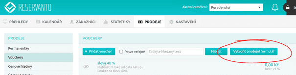 Chcete-li mít na svém webu i prodejní formulář, ve kterém si budou moct vaši zákazníci zakoupit vouchery, klikněte na tlačítko Vytvořit prodejní formulář a podobně jako u rezervačního formuláře si vygenerujte HTML kód či odkaz. Ten ale bude fungovat jen v případě, že máte povoleny Online platby.
