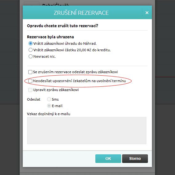 - k uvolnění časového bloku došlo v administraci interním uživatelem, který při stornování označil volbu „Neodesílat upozornění čekatelům na uvolnění termínu„