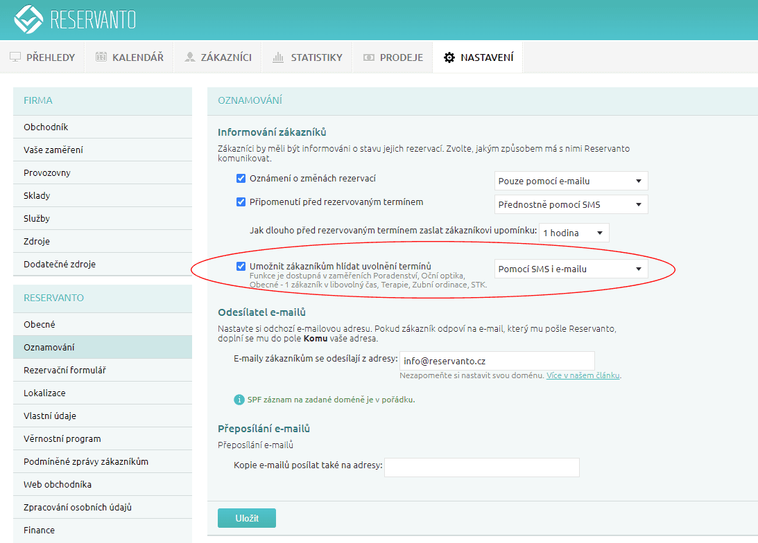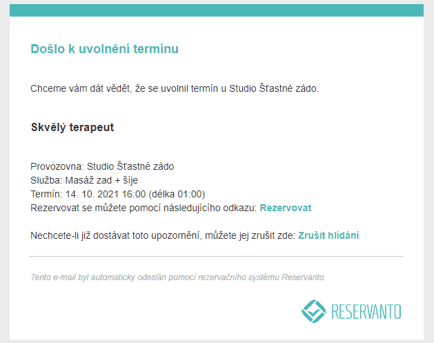 Systém bude hlídat uvolnění dostatečně velkého časového bloku u zvoleného zdroje (či více zdrojů v případě vybrané funkce „Je mi to jedno“). Jakmile se díky stornování rezervace nebo smazání volna uvolní časový blok, do kterého se vejde zákazníkem vybraná služba, odešle systém zákazníkovi zprávu (dle nastavení e-mail či SMS).