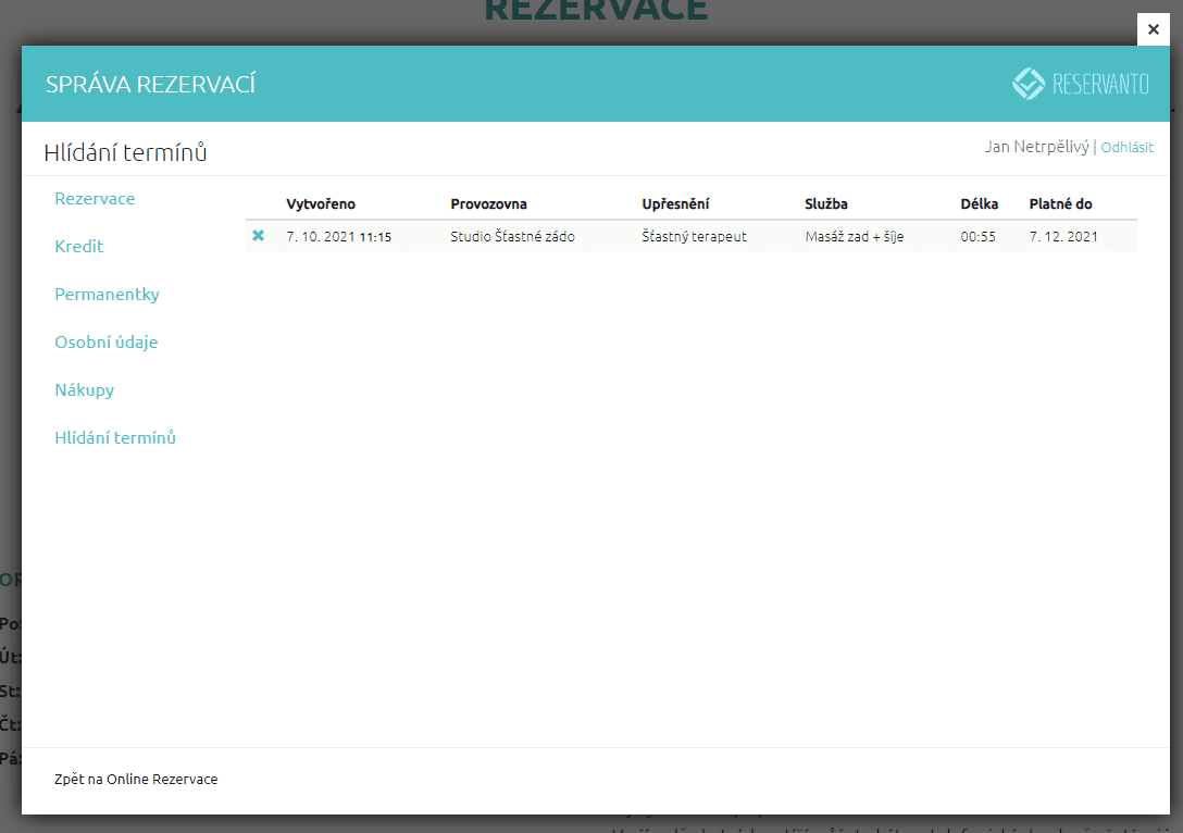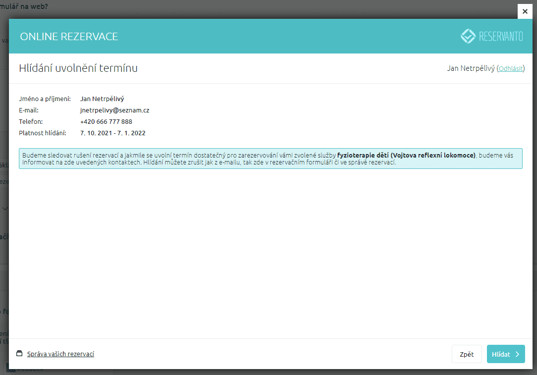 Systém hlídá uvolnění termínů jen po omezenou dobu, která se řídí nastavením v Nastavení / Obecné / Časová omezení rezervací. Po vypršení se aktivní hlídání samo ukončí.