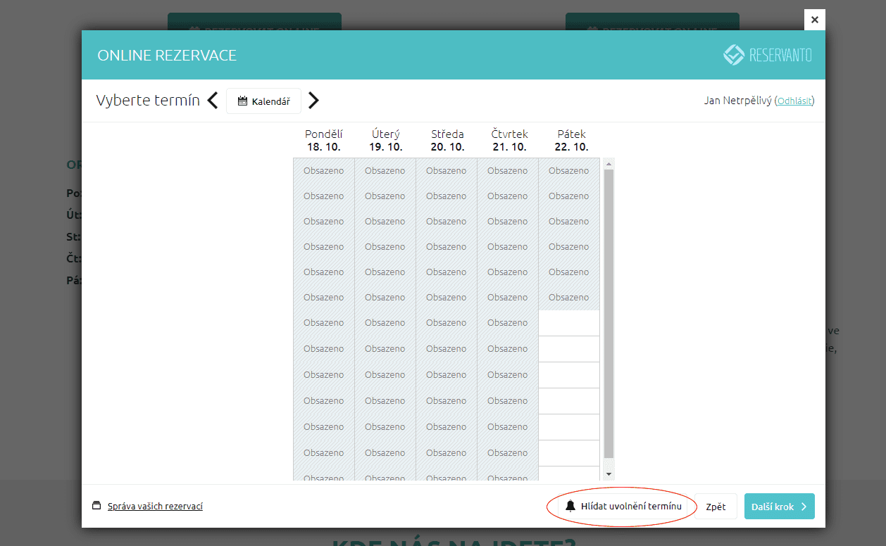 Zákazníkovi se zobrazí v rezervačním formuláři pod kalendářem tlačítko „Hlídat uvolnění termínu“.