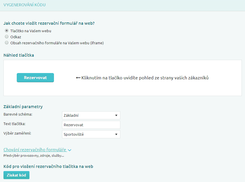 Rezervační formulář lze ještě upravit tak, aby směřoval na konkrétní zaměření, provozovnu, zdroj (např. pracovníka) nebo službu. Stačí v části Chování rezrvačního formuláře zvolit vše potřebné a až poté kliknout na Získat kód.