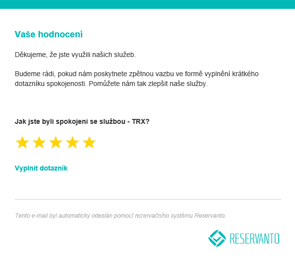 Pokud si tuto funkci zapnete, budou vaši zákazníci přibližně hodinu po proběhlé rezervaci vyzváni e-mailem k vyplnění dotazníku spokojenosti. Ohodnotit mohou celkově vás a také službu, na kterou měli rezervaci.